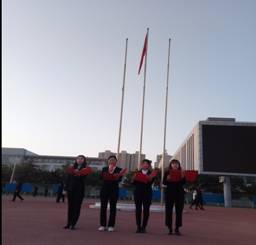 国旗护卫队迈着整齐铿锵的步伐走向国旗台,伴着雄壮的《义勇军进行曲》,鲜艳的五星红旗在师生们庄严的注目礼中冉冉升起,迎风飘扬。