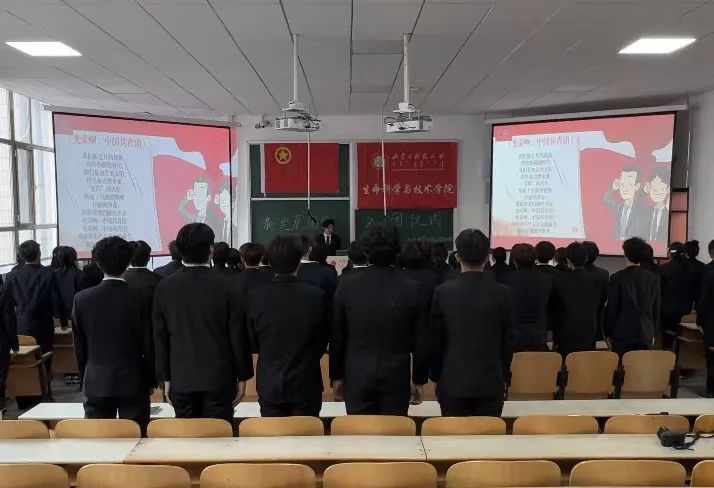 唱《中国共产主义青年团团歌》环节将仪式推向高潮。新老团员并肩而立,歌声嘹亮,充满力量。现场“新发展团员入团仪式”的醒目字样与团员们坚定的目光交相辉映,洋溢着青春的朝气与信仰的光芒。通过《中国共产主义青年团团歌》,新团员进一步感受到共青团的光荣与使命,坚定了为组织增光、为时代建功的决心。